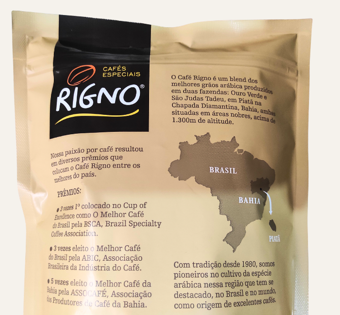 O Café Rigno é um blend exclusivo de grãos 100% arábica, cultivados nas fazendas Ouro Verde e São Judas Tadeu, em Piatã, Chapada Diamantina (BA), acima de 1.300 metros de altitude.